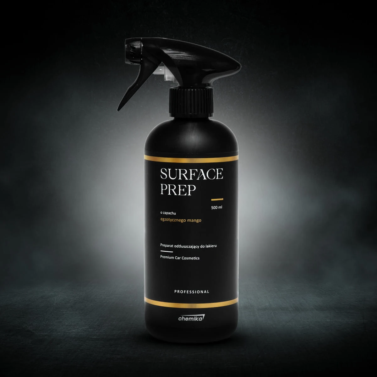 Preparat do odtłuszczania lakieru samochodowego CHEMIKA Surface Prep służy do usuwania pozostałości po pastach polerskich i przygotowuje powierzchnię do aplikacji wosku, powłok ochronnych oraz sealantu. Jego formuła nie pozostawia na lakierze smug i zapewnia przyjemny zapach egzotycznego mango.