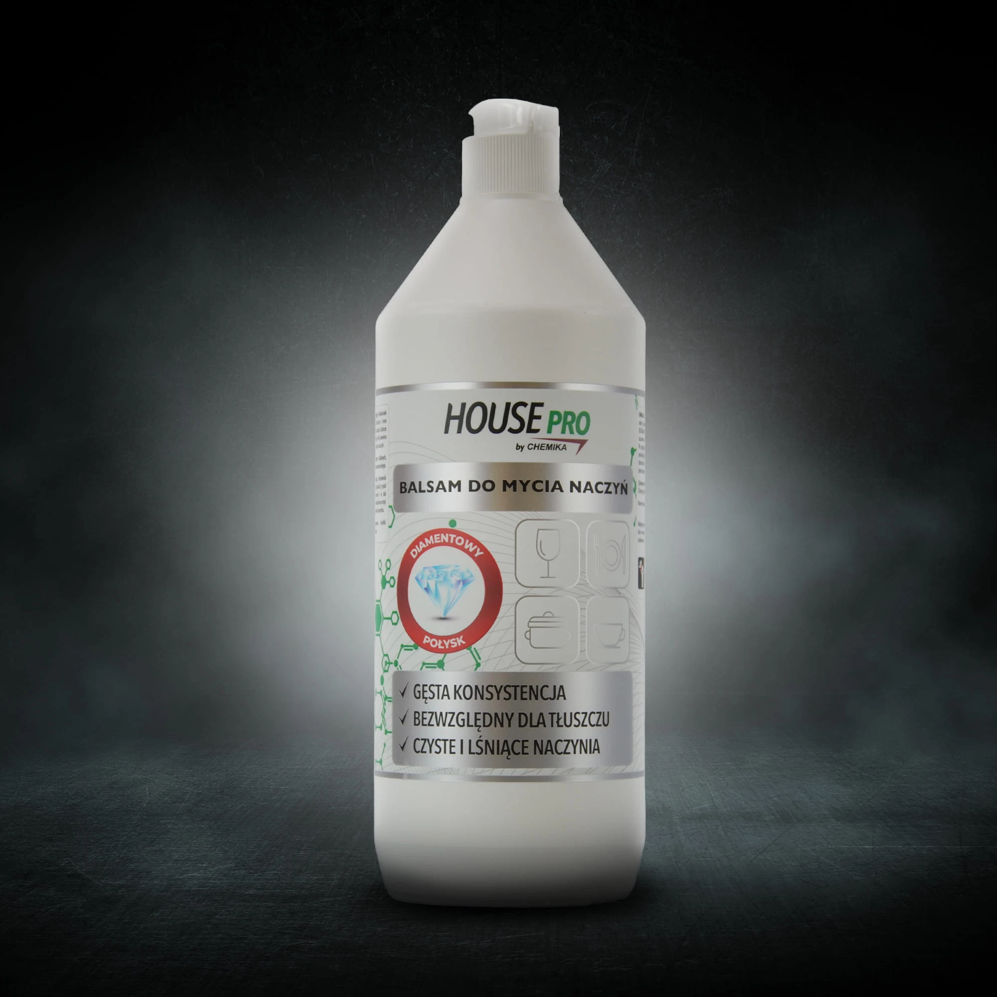 Łagodny balsam do ręcznego mycia naczyń to preparat posiadający doskonałe własności myjące i zapewniający efekt błyszczących naczyń. Doskonale usuwa brud, tłuszcze i inne zanieczyszczenia spożywcze. Wyrób charakteryzuje się przyjemnym, słodkim zapachem, bardzo dobrze się pieni. Dzięki specjalnie opracowanej formule chroni skórę przed nadmiernym wysuszeniem przy codziennym myciu naczyń i dodatkowo delikatnie ją nawilża. Nie zawiera barwników. Do mycia naczyń poleca się również inny produkt marki HOUSE PRO Żel do mycia naczyń.